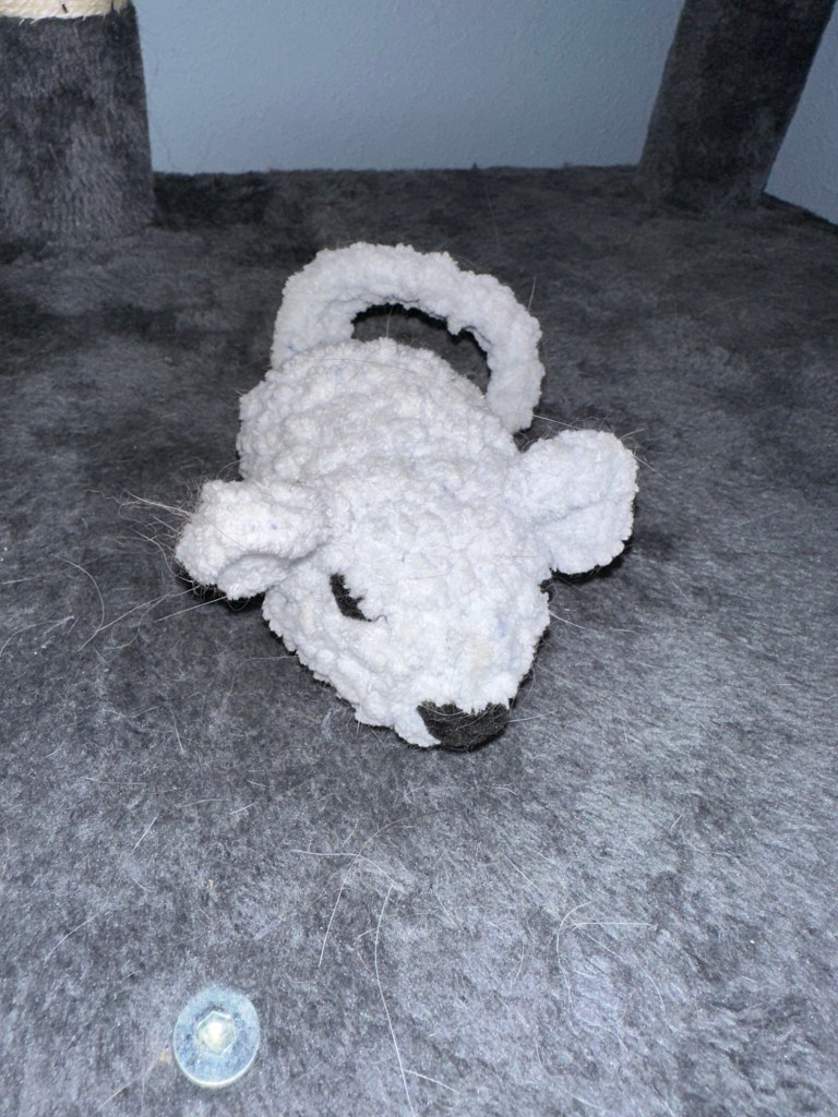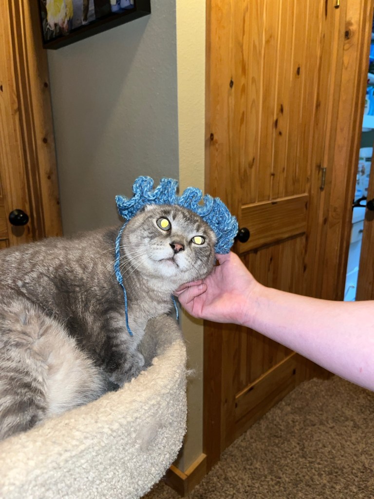 Hello! Today I’m sharing some of the most recent cat accessories and toy projects I’ve made for them. The cat hammock has yet to be hung up, but I’m sure once it is I’ll have pictures up as quickly as possible. The hammock was quite a challenge to figure out. I could not find a YouTube tutorial for the life of me, so I just went ahead and tried what I thought would hold best. I ended up taking two wreath rings, crocheted a lining around both rings, then crocheted in the round around one of the rings, attached it to the other, and then made the straps. My brain was cooked by the end of that project haha. The mouse was pretty simple and only took about 20mins. Finally, the cat hat. This is by far my favorite item I’ve made for them. Loki isn’t exactly the biggest fan (meaning he won’t try it on), but Lunatic doesn’t mind it nearly as much. Somehow with the biggest stroke of luck imaginable, we were able to capture a photo of Alfie with the hat on! It will probably be the only time that happens, so I’m stoked about having that beautiful photo. Well, that’s all I have for this post. Bye for now :).