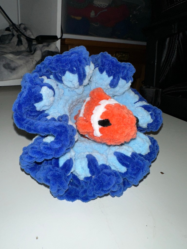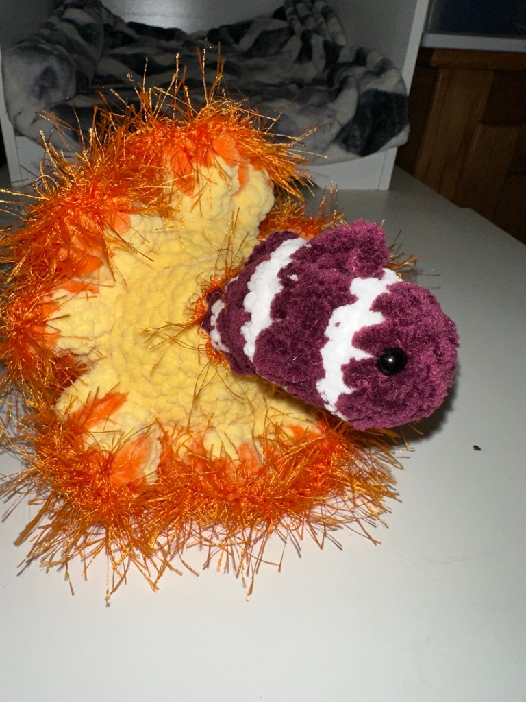 Hello! A few days ago, I found a clownfish anemone fidget pop toy pattern. It’s called the anemone burst biodiversity bundle from CotyLoops off of Etsy if anyone is interested. Anyways, it has very quickly become one of my favorite toys to create! There are 30 different variations you can make with the bundle, and that’s only if you go by standard sea life colorways. The combinations are limitless if you don’t care about the color being accurate to real life, so I’ve got a lot of options. One of my favorite details to add on to the anemone is eyelash yarn. I think it really makes the toy stand out, plus the yarn is extra soft. Adding the frills to anemone has also opened up many more doors for what I can add to other creatures. I’m thinking a sea slug or starfish would be really cool with some eyelash yarn. After that thought, I had some help searching for some vintage faux fur that is similar to the yarn used for the anemone and was lucky enough to find a 40-skein lot with at least 24 different colors! So now I’m just waiting on that box to make some frilly animals. I can’t wait for the variety! Well, that’s all I have for this post. Bye for now :).