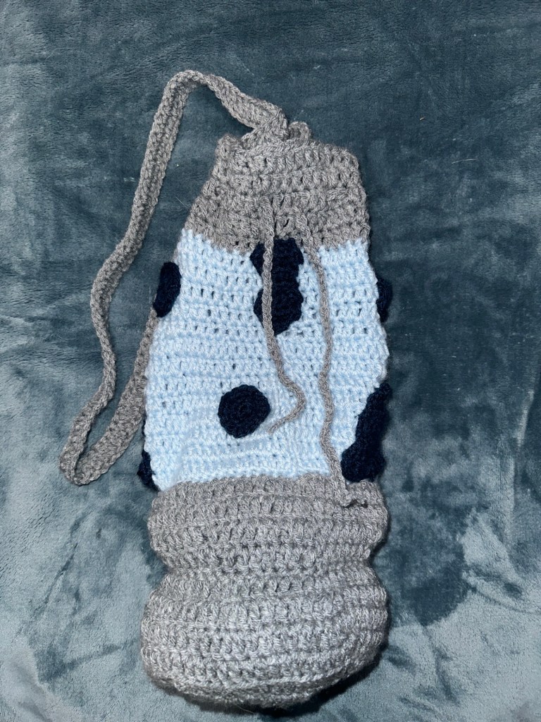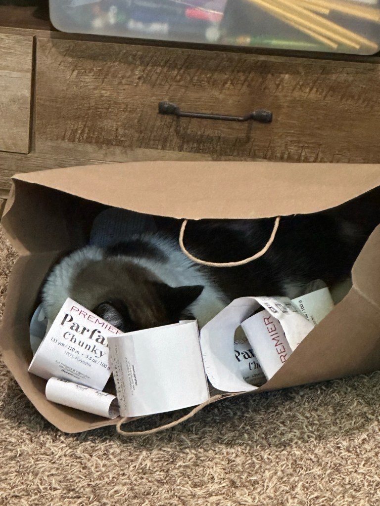 Hello! I have been busy with stuff that is not crochet for once! I’ve had an interest in gardening these past couple of years, but I was not capable of committing to that type of task until now. Now, I’m finally able to start helping with the garden planning. I’ve spent some time outside attempting to help replant our front lawn with clover, setting up garden boxes, and finally getting starts for the garden. Today though, I spent most of the day making my new lava lamp bag. It is a bit larger than I anticipated, but at least it can hold more stuff. I’m going to try and figure out a way to not have to sew on the bubbles and just tapestry crochet them into the bag. It might take me a bit of time to figure out, but I think it will make the bag come out much cleaner. I also snagged a picture of Luna’s new favorite napping spot. Unfortunately, she will not get to keep that spot since I don’t hang onto the yarn bags and labels haha. Well, that’s all I have for this post. Bye for now :).