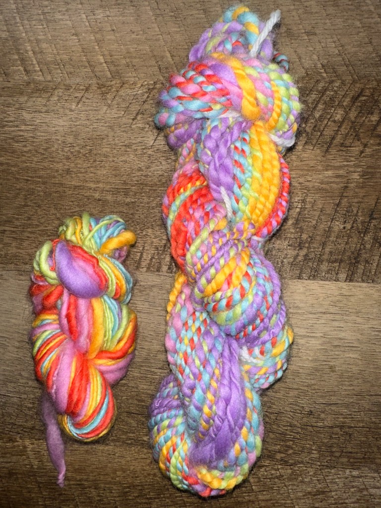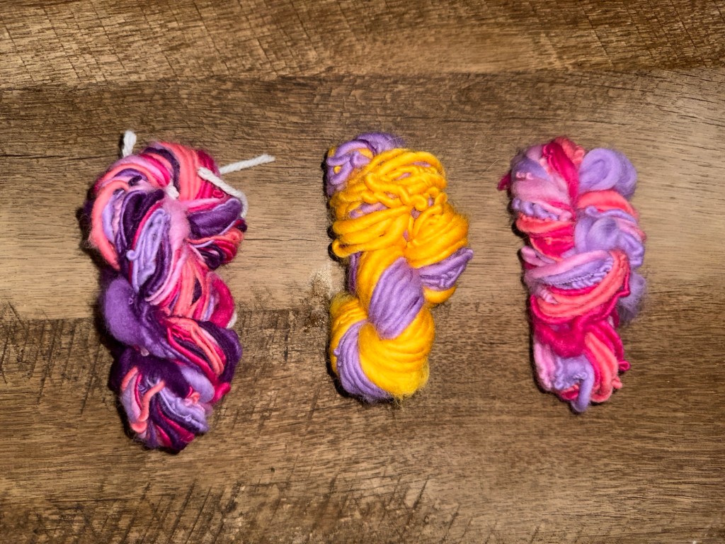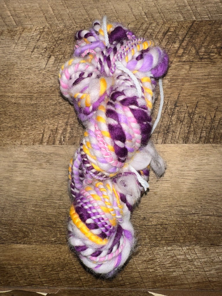 Hello! I’m so excited that I have a lot of new fiber I’ve gotten to spin up lately. The fiber is all solid colors, so I also get to build my own color scheme instead of buying pre dyed fiber with a pre picked color scheme. I got plenty of undyed roving as well, that way I can practice my yarn/fiber dyeing techniques. The mini test skeins I made were mostly to get a feel for how this new fiber spins up, and how I should prepare my fiber for the spinning process. Once I got a handle on that, I made an attempt at a fractal yarn. I say attempt because a true fractal yarn consists of 2 separate gradient bobbins, and this skein had one gradient and one solid color. A good first try though. My 2nd-5th skeins all turned out to be relatively okay fractals. What I was personally most impressed with, was how the thickness of the yarn at any given spot was consistent throughout mostly. I guess that happens when you practice haha. Well, that’s all I have for this post. Bye for now :).